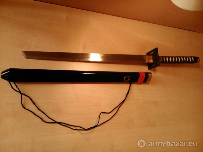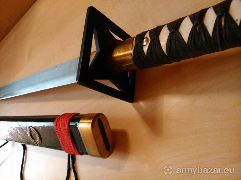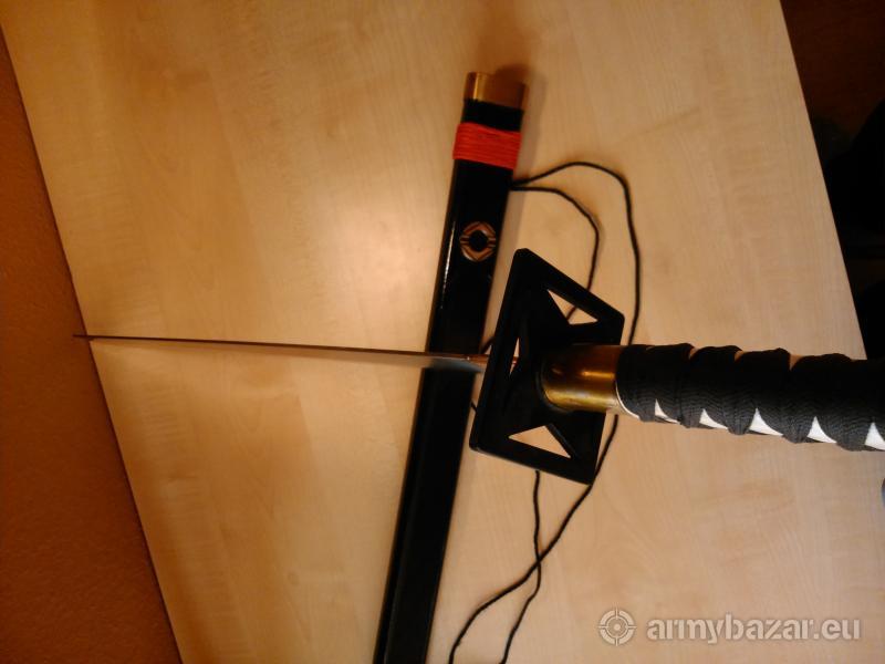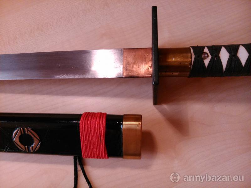 Leírás: Kézműves Ninja kard-gyüjteményből sportcélra eladó! Nem díszkard! A penge anyaga magas széntartalmú rugalmas szerszámacél 48HRC-keménységű. A markolatot a pengével egy kúpos csap tartja össze súlypontja tökéletes. Főbb jellemzők: -Minőségi és dekoratív kiegészítők -Markolatgyűrű, markolatkupak, lötyögés gátló és gallér (sárgaréz ipari ezüst és vörösréz felhasználásával készültek -Esztétikusan tekert markolat -Teljes hossz: 750mm -Penge hossz: 500mm -Markolathossz: 242mm -Szélesség: 33mm -Vastagság: 2.65mm -Hárítólap: 76x76x5mm-könnyített/bőralátét -Tömeg: 690gramm